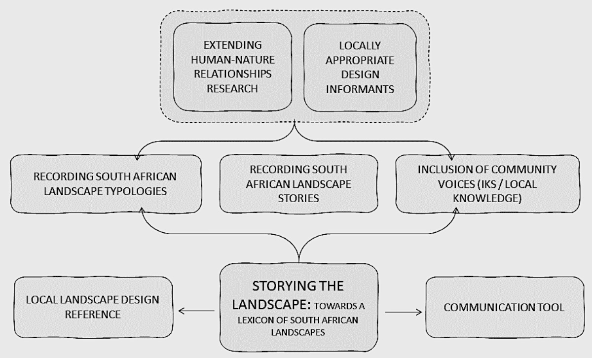 This paper reports on the progress of the ‘Storying the Landscape’ project. Supported by University of Pretoria RDP Seed Funding, this three-year pilot project initiates a potentially larger project to provide additional, recent, and inclusive landscape reference material for the South African context. The project emerged as an outcome of a recent PhD study which considered environmental justice and local park making informants, with human-nature relationships as a central driver of both (Shand, 2023). The previous study concluded with a series of findings including the need to promote 1) better knowledge sharing across the divide of professionals and communities, and 2) more locally representative design informants, in more accessible formats. The current study is, in part, a response to some of these findings.